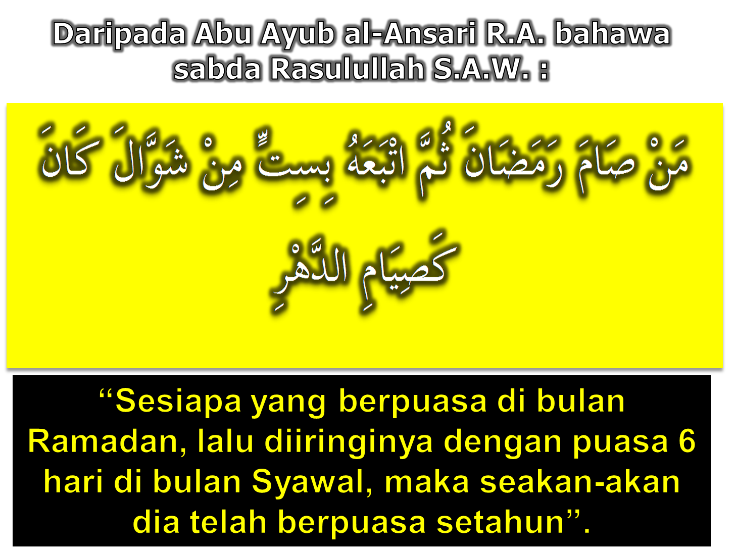 Sesiapa yang berpuasa Ramadhan kemudian dia mengiringinya dengan enam hari dari bulan Syawal maka seperti ia berpuasa sepanjang tahun.”— Muslim no: 1164